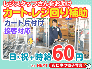カートの整頓・移動・清掃や、レジ周りの業務補助をおこなう仕事です。お客様からの問い合わせのサポートなどもおこないます。
